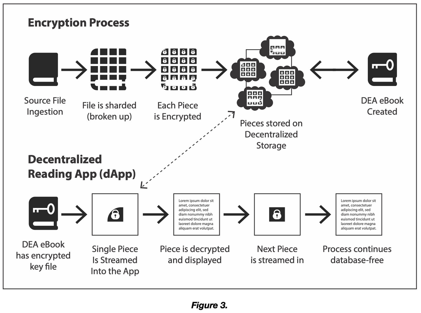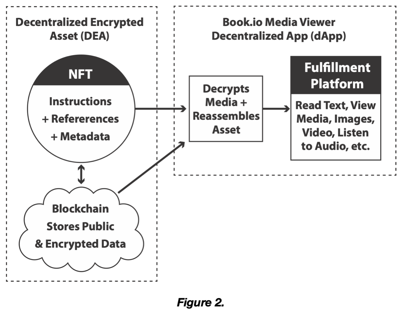 Decentralized Encrypted Assets are a further expansion of blockchain technology beyond the current NFT paradigm. Decentralized Encrypted Assets are sometimes referred to also as “NFT books,” “Programmable Books,” “Smart NFTs,” or “Utility NFTs” — however, the most accurate acronym is a “DEA.” The simplest definition of a DEA media is that it uses a combination of Web3 technology to produce unique DRM-protected digital assets. Figure 1 breaks down each of the contributing components: